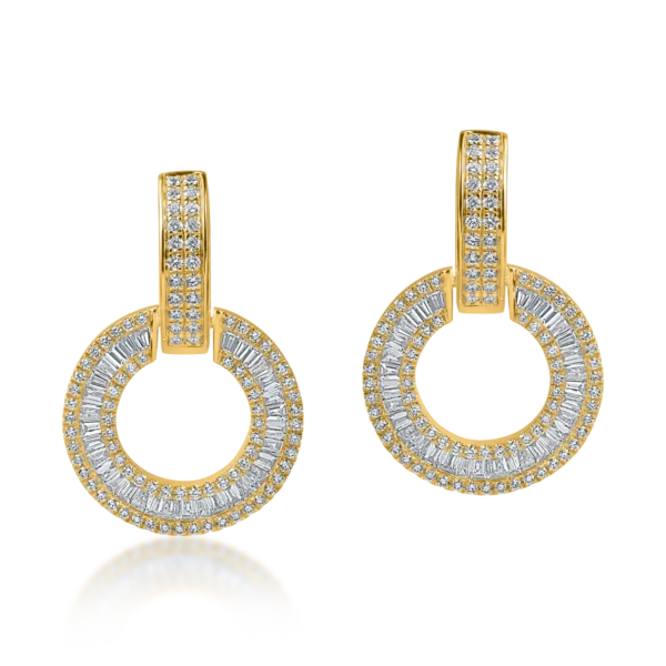 Cercei rotunzi din aur galben cu diamante baguette si rotunde de 2.1ct