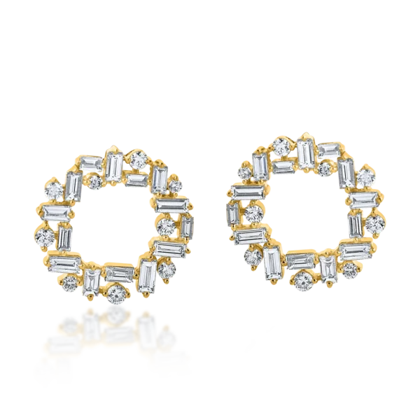 Cercei rotunzi din aur galben cu diamante baguette si rotunde de 1.5ct