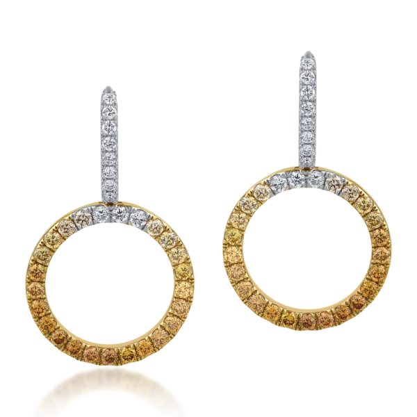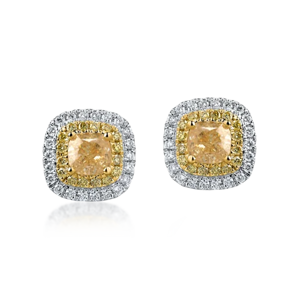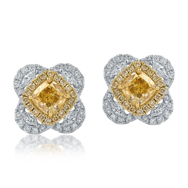 Cercei din aur alb-galben cu diamante galbene cushion si round si diamante incolore de 1.3ct