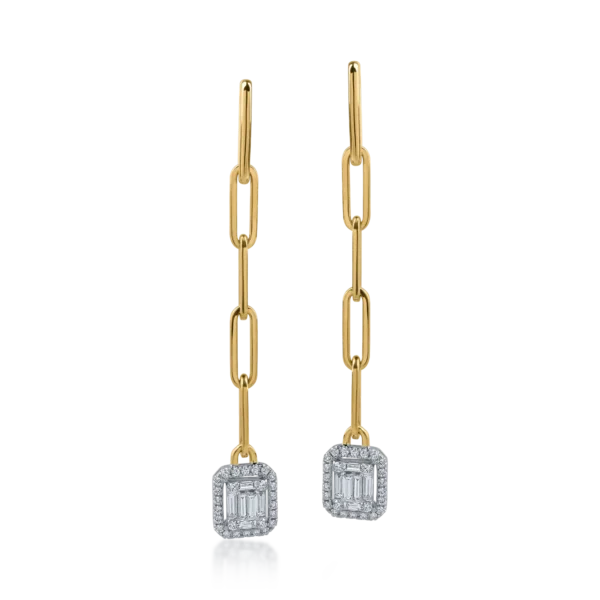Cercei din aur alb-galben cu diamante baguette si rotunde de 0.99ct