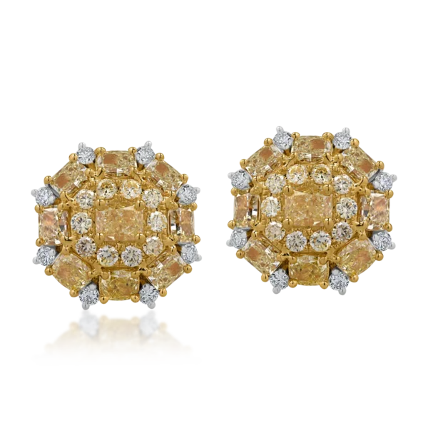 Cercei din aur alb-galben cu diamante galbene cushion de 4ct si diamante incolore round de 0.34ct