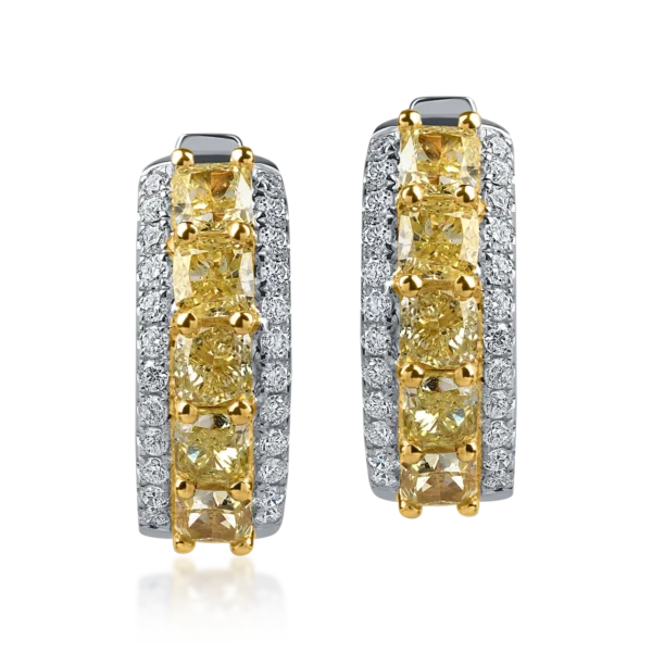Cercei din aur alb-galben cu diamante galbene cushion si incolore de 2.2ct