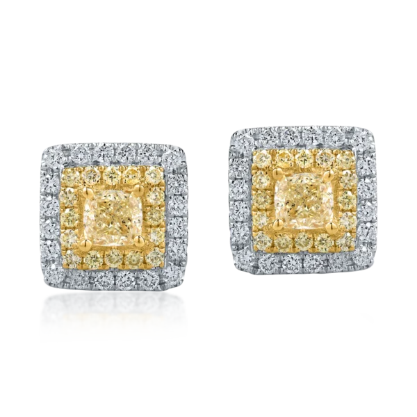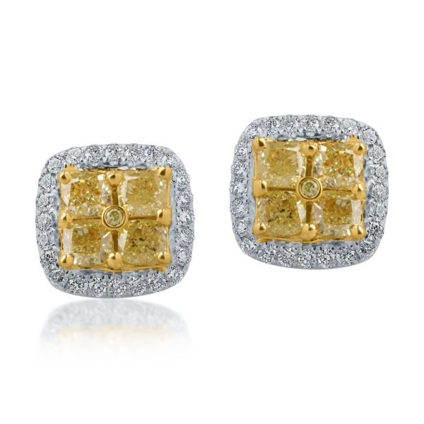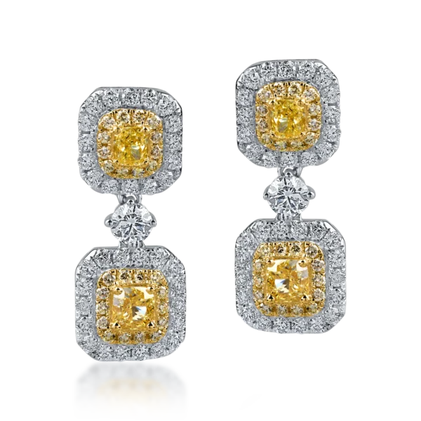 Cercei din aur alb-galben cu diamante galbene cushion si round si diamante incolore de 2.4ct