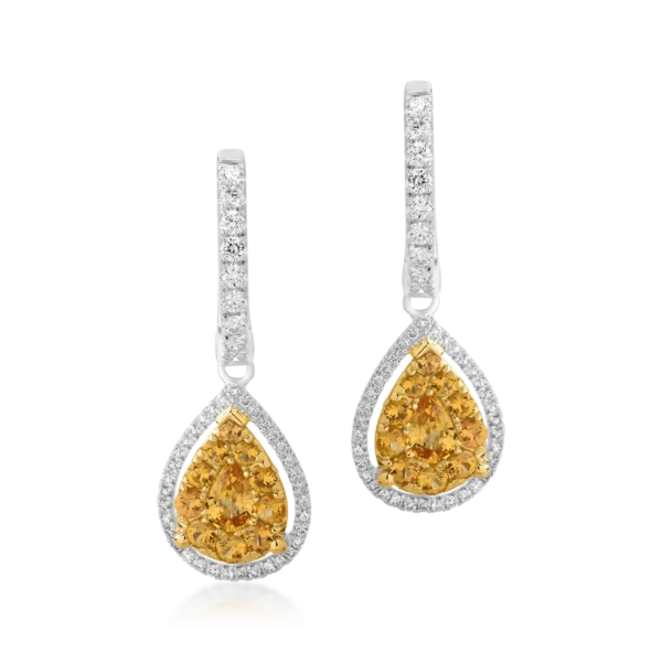 Cercei din aur alb-galben cu safire galbene pear si rotunde de 0.94ct si diamante de 0.48ct