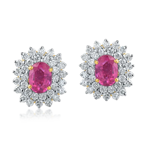 Cercei din aur alb-galben cu rubine ovale si diamante de 3.4ct