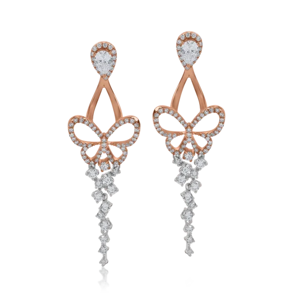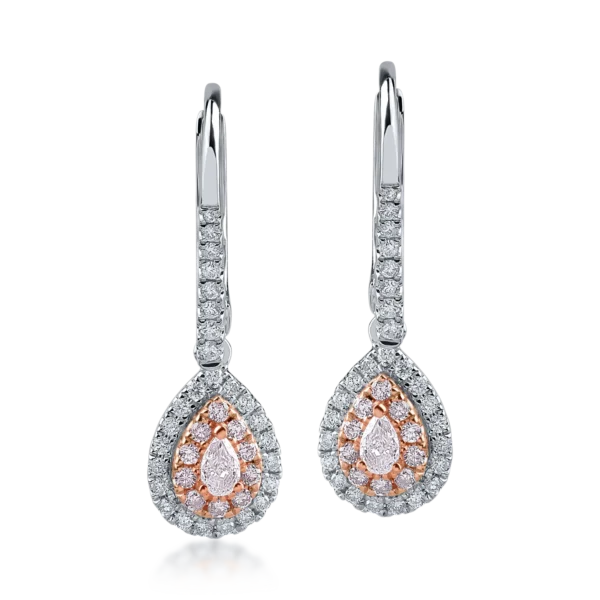 Cercei din aur alb-roz cu diamante roz si incolore pear si rotunde de 0.9ct