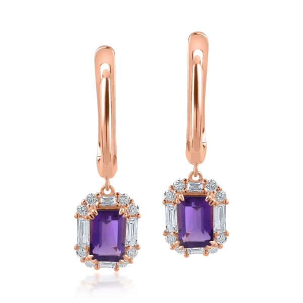 Cercei din aur roz cu ametiste de 1.09ct si diamante baguette si rotunde de 0.38ct