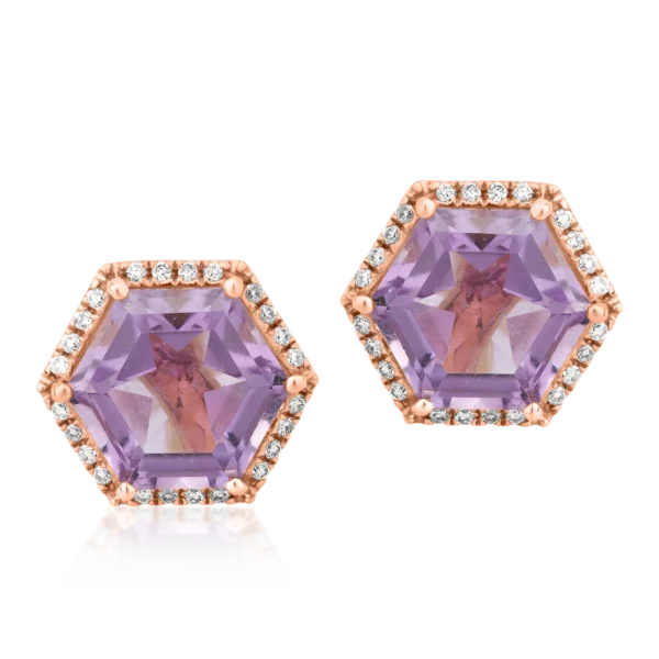 Cercei din aur roz cu ametist hexagonal de 4.27ct si diamant de 0.13ct
