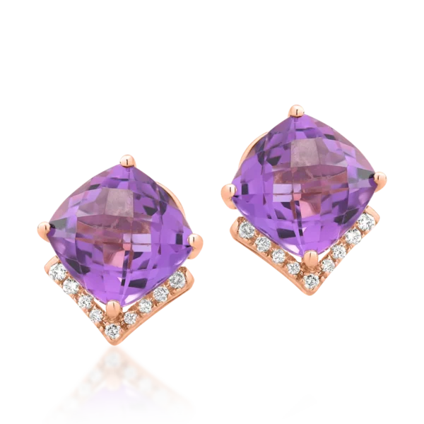 Cercei din aur roz cu ametiste cushion de 4.5ct si diamante de 0.1ct