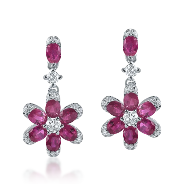 Cercei floare din aur alb cu rubine ovale si diamante de 2.1ct
