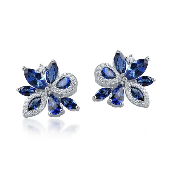 Cercei floare din aur alb cu safire pear si marquise de 2ct si diamante de 0.2ct