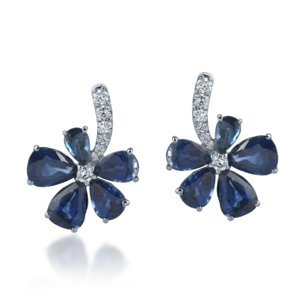 Cercei floare din aur alb cu safire pear de 6.08ct si diamante de 0.28ct