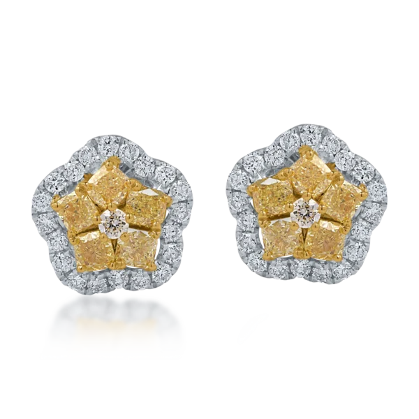 Cercei floare din aur alb-galben cu diamante galbene si incolore de 1.5ct