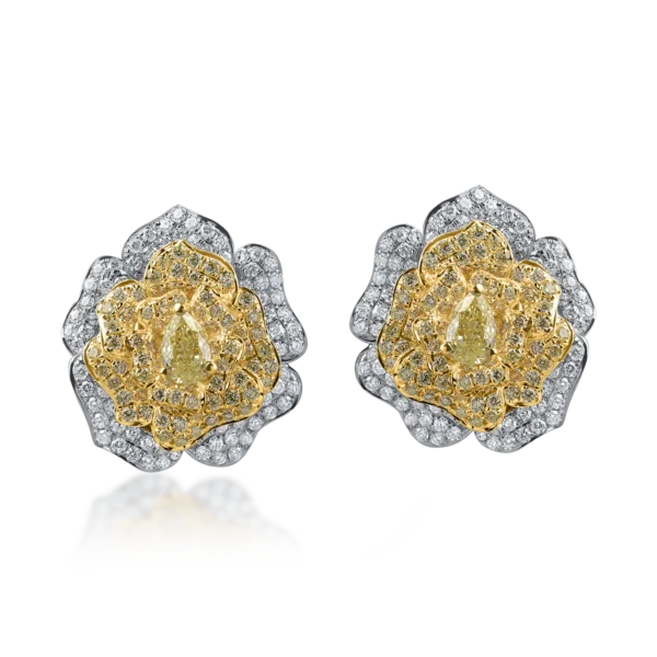 Cercei floare din aur alb-galben cu diamante galbene si incolore round si pear de 2.6ct