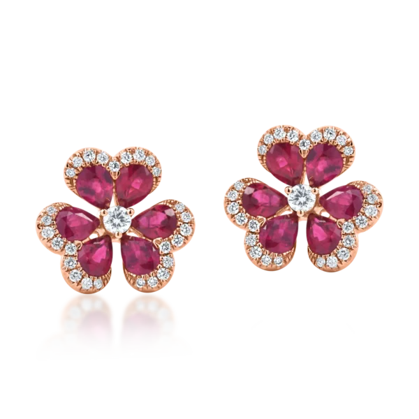 Cercei floare din aur alb-roz cu rubine pear si diamante de 2.5ct