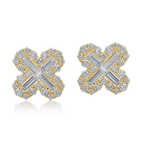 Cercei floare din aur galben cu diamante baguette si rotunde de 1.0ct