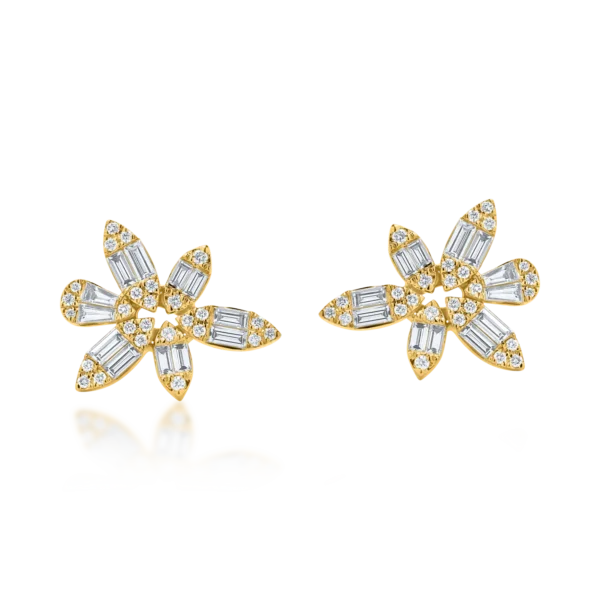Cercei floare din aur galben cu diamante baguette si rotunde de 1.6ct