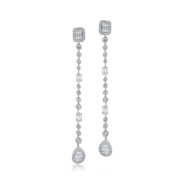 Cercei lungi din aur alb cu diamante pear si round de 4.6ct