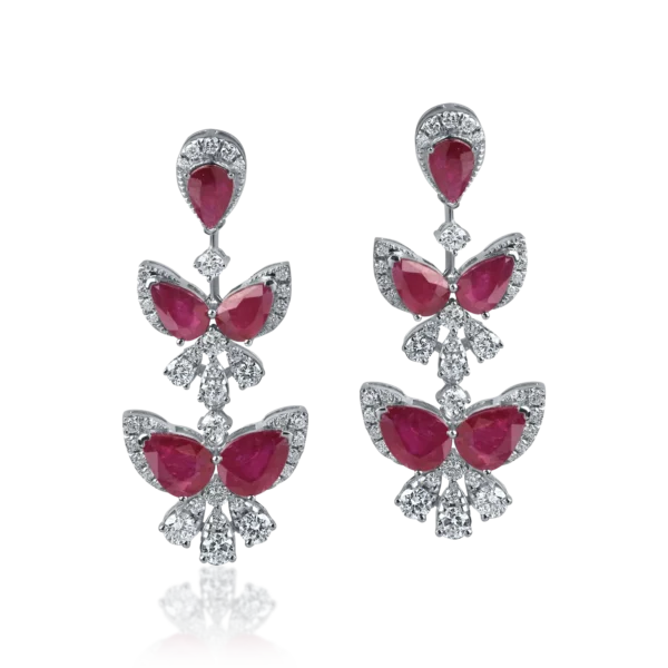 Cercei lungi din aur alb cu rubine pear de 6.1ct si diamante round de 1.5ct
