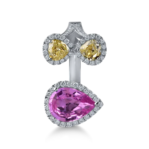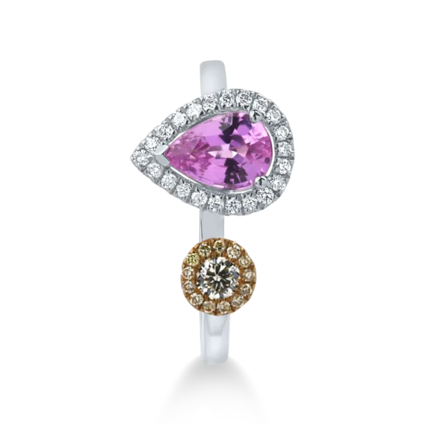 Inel deschis din aur alb cu safir roz pear si diamante galbene si incolore de 2.6ct