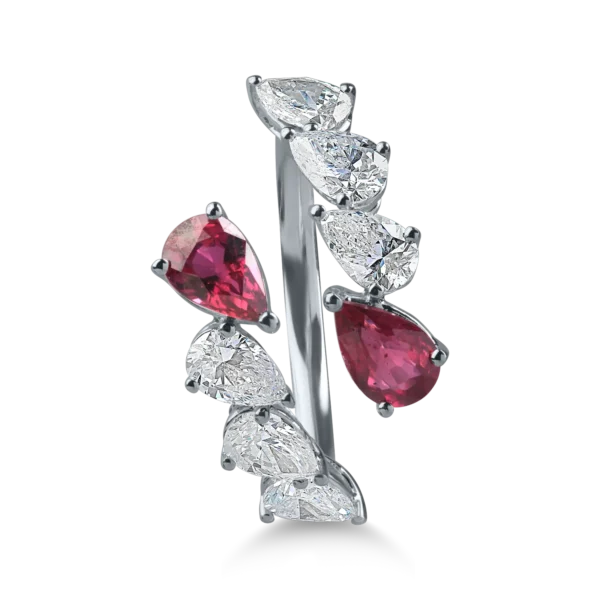 Inel deschis din aur alb cu rubine pear de 0.95ct si diamante pear de 1.25ct