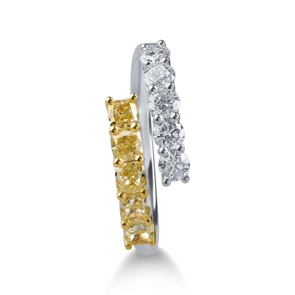 Inel deschis din aur alb-galben cu diamante galbene cushion si diamante incolore de 1.39ct