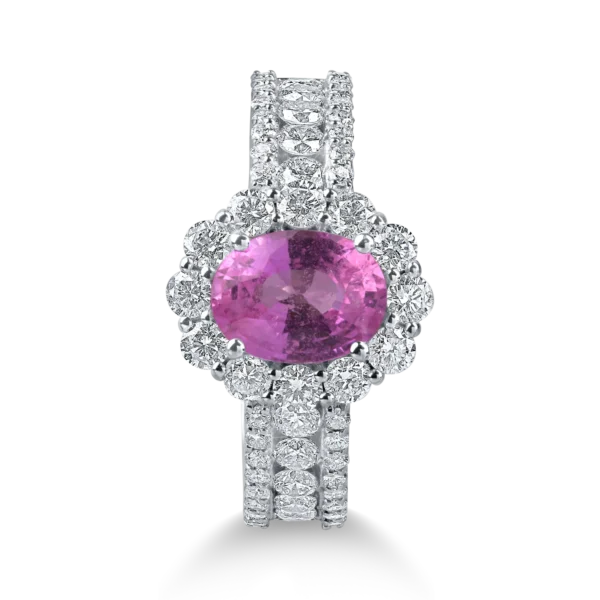 Inel din aur alb cu un safir roz oval de 1.69ct si diamante de 1.2ct