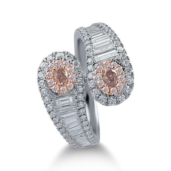Inel din aur alb-roz cu diamante roz ovale si rotunde de 1.3ct si diamante incolore baguette si rotunde de 1.09ct