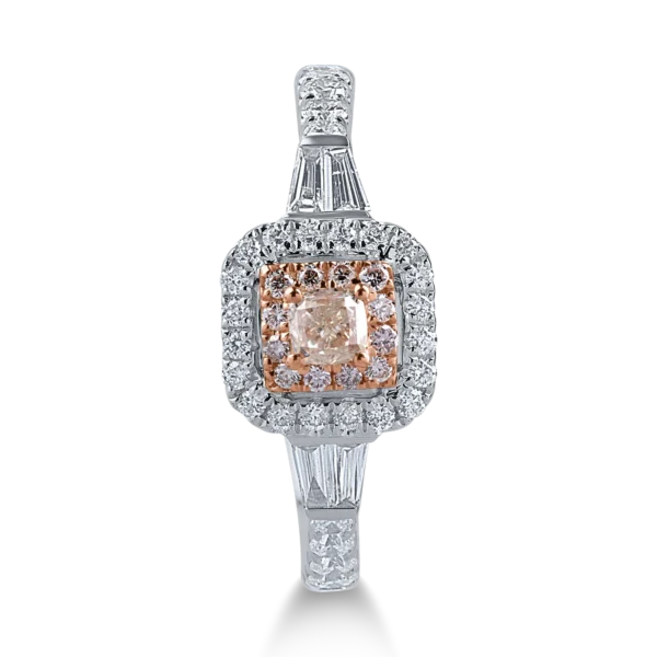 Inel din aur alb-roz cu diamante roz cushion si rotunde si diamante incolore baguette si rotunde de 1ct