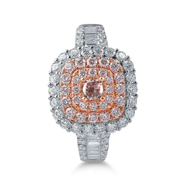 Inel din aur alb-roz cu diamante roz cushion si rotunde si diamante incolore baguette si rotunde de 1.5ct