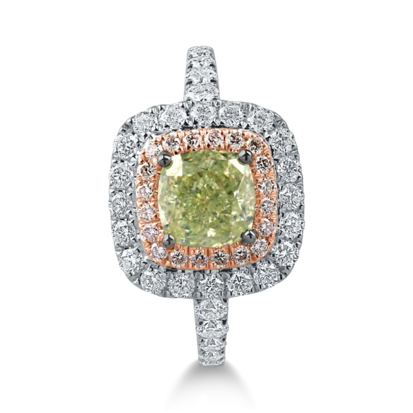 Inel din aur alb-roz cu un diamant verde cushion de 1ct si diamante incolore de 0.3ct