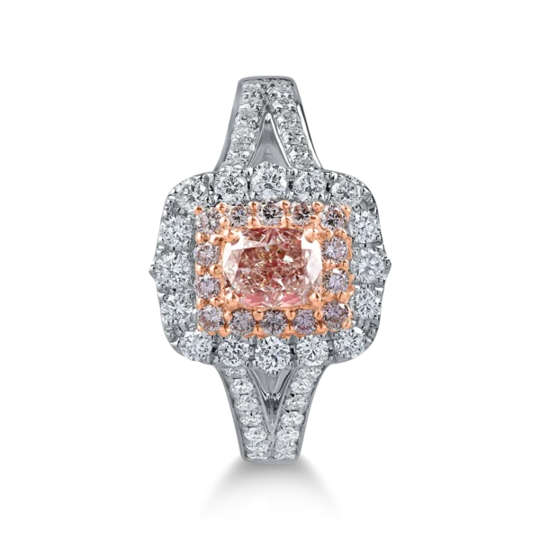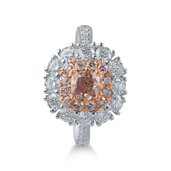 Inel din aur alb-roz cu un diamant fancy roz cushion de 0.7ct si diamante roz si incolore de 1.5ct