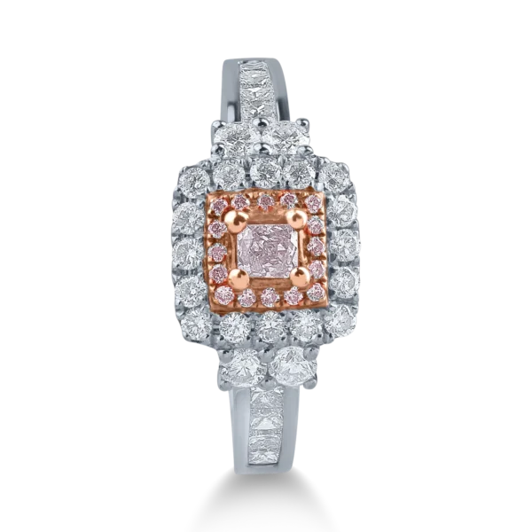Inel din aur alb-roz cu un diamant fancy roz cushion de 0.5ct si diamante roz si incolore de 0.75ct