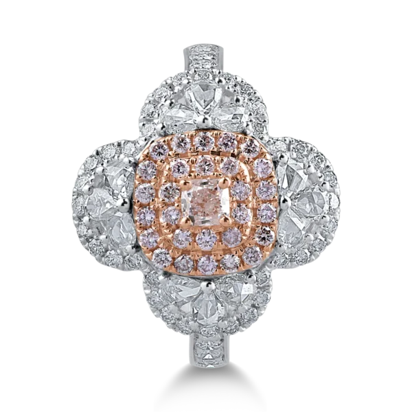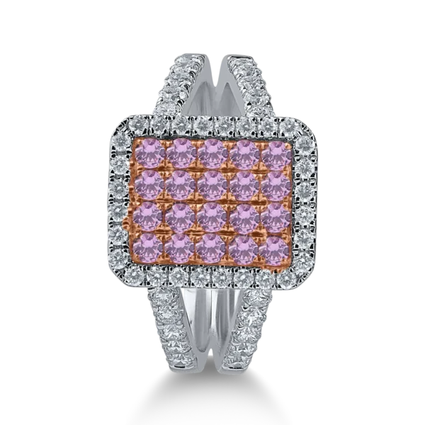 Inel din aur alb-roz cu diamante transparente rose si rotunde de 0.86ct si diamante roz cushion si rotunde de 0.43ct