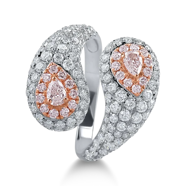Inel din aur alb-roz cu diamante transparente de 2.09ct si diamante roz pear si rotunde de 0.59ct