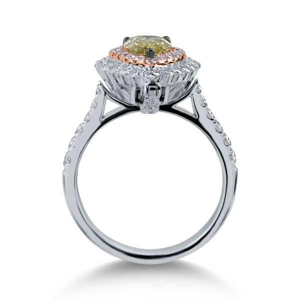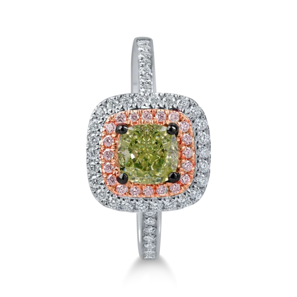 Inel din aur alb-roz cu un diamant verde central pear de 1.27ct si diamante incolore si roz halo pave de 1.12ct
