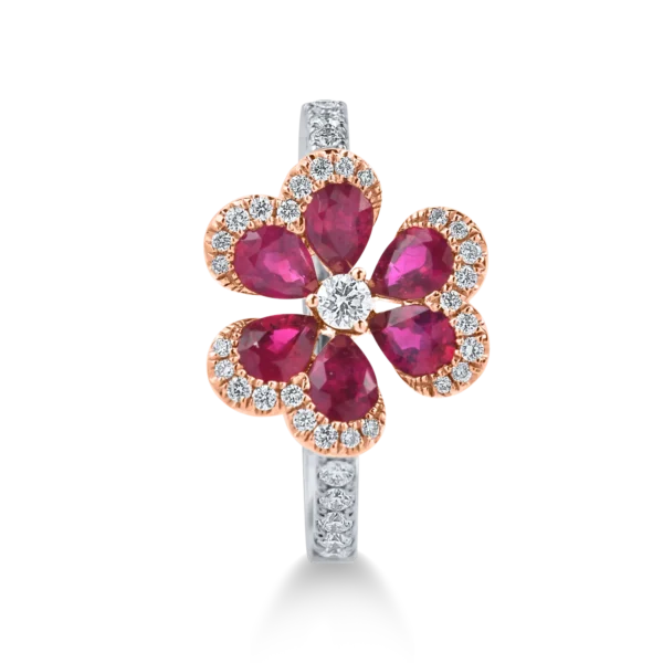 Inel floare din aur alb-roz cu rubine pear de 1ct si diamante de 0.3ct