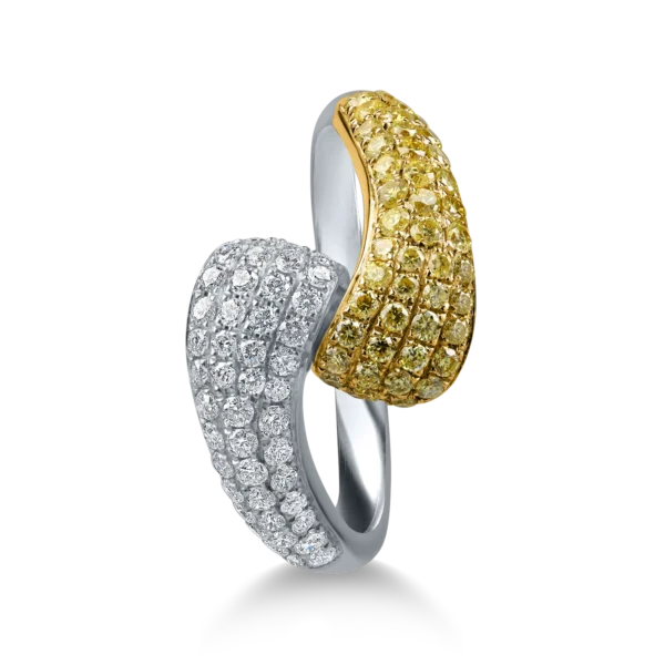 Inel geometric din aur alb-galben cu diamante galbene si incolore de 0.86ct