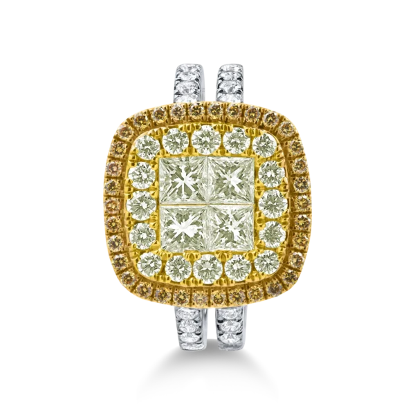 Inel geometric din aur alb-galben cu diamante galbene princess si rotunde si diamante incolore de 1.8ct