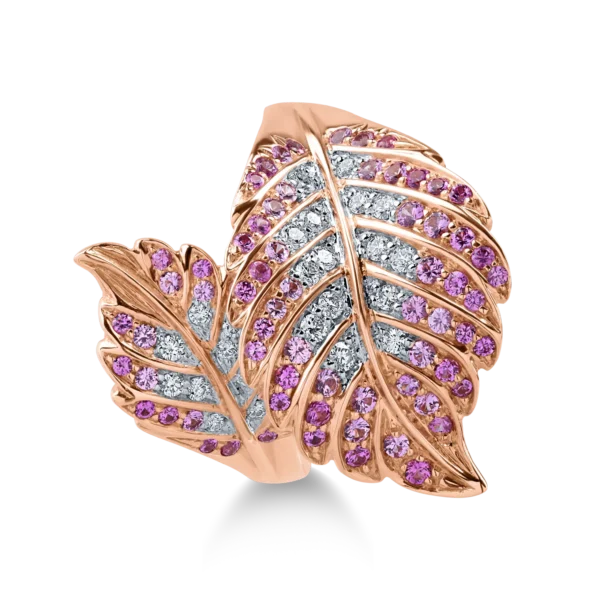 Inel cu frunza din aur roz cu diamante de 0.22ct si safire roz de 0.67ct
