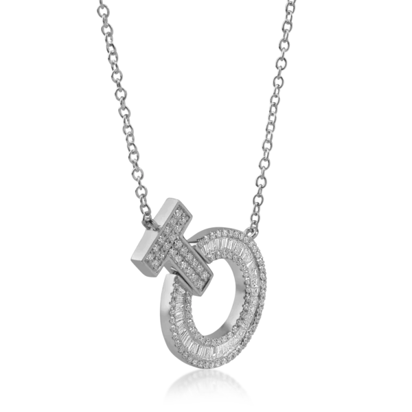 Lant cu pandantiv cerc din aur alb cu diamante baguette si rotunde de 0.6ct