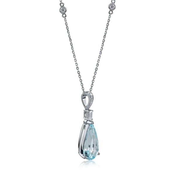 Lant cu pandantiv din aur alb cu acvamarin pear de 3.96ct si diamante baguette si rotunde de 0.15ct