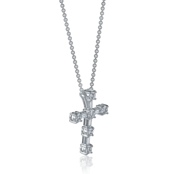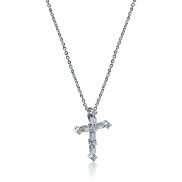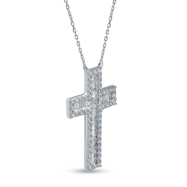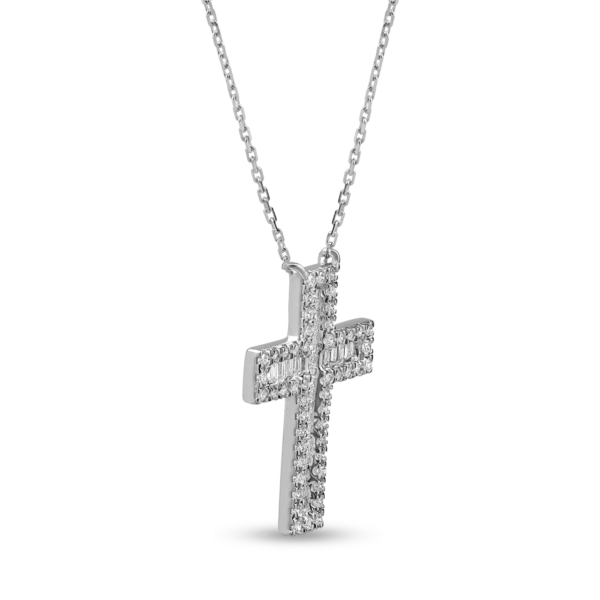 Lant cu pandantiv cruce din aur alb cu diamante baguette si rotunde de 0.7ct