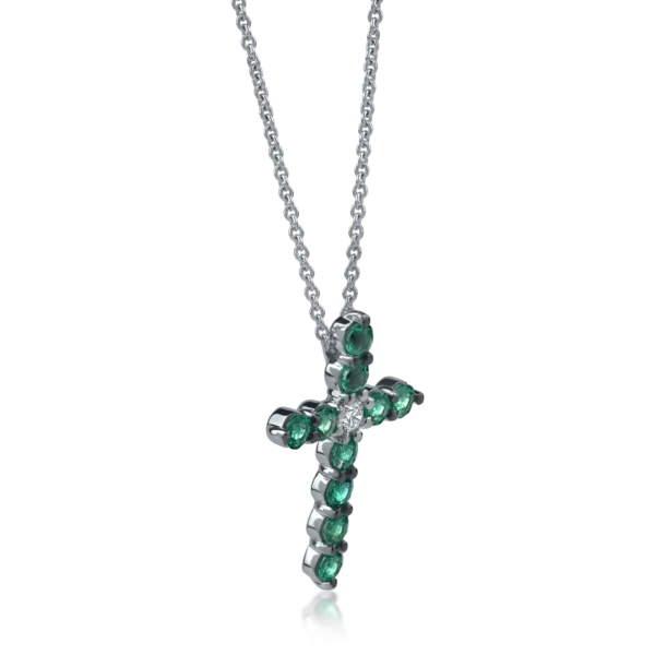 Lant cu pandantiv cruce din aur alb cu diamant de 0.09ct si smaralde de 0.85ct