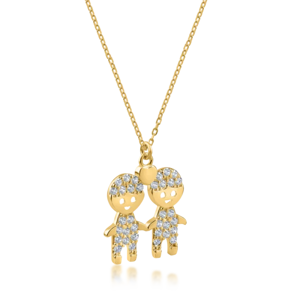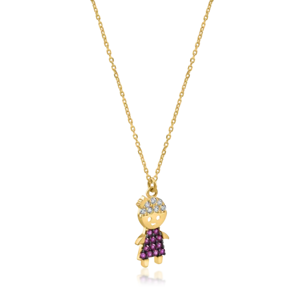 Lant cu pandantiv copil din aur galben cu zirconii roz si albe