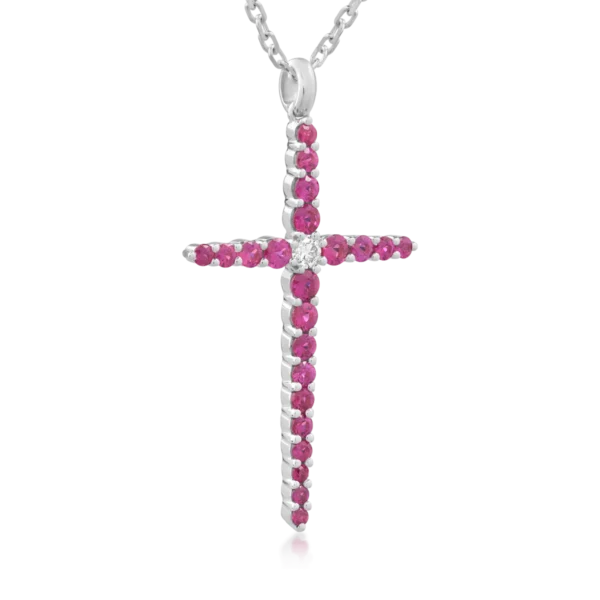 Lant cu pandantiv cruce din aur alb cu diamant de 0.09ct si rubine de 1.08ct