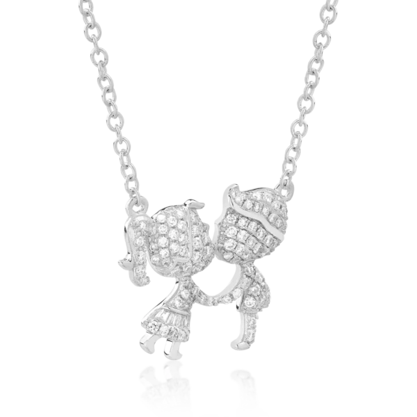 Lant cu pandantiv fetita si baietel din aur alb cu diamante baguette si rotunde de 0.25ct
