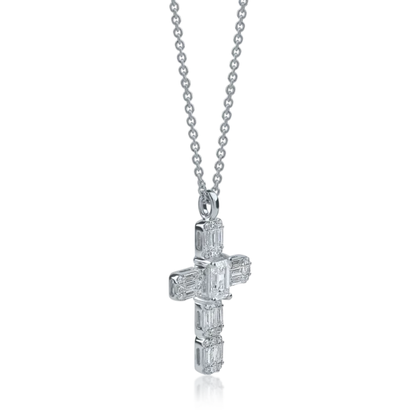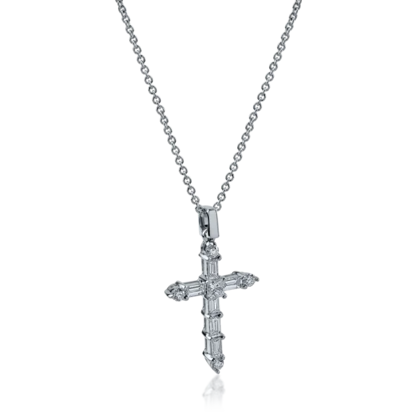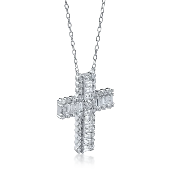 Lant cu pandantiv cruce din aur alb cu diamante baguette si rotunde de 1.1ct