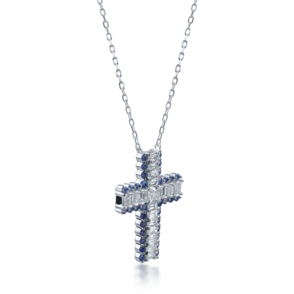 Lant cu pandantiv cruce din aur alb cu diamante baguette si rotunde de 0.93ct si safire de 0.48ct