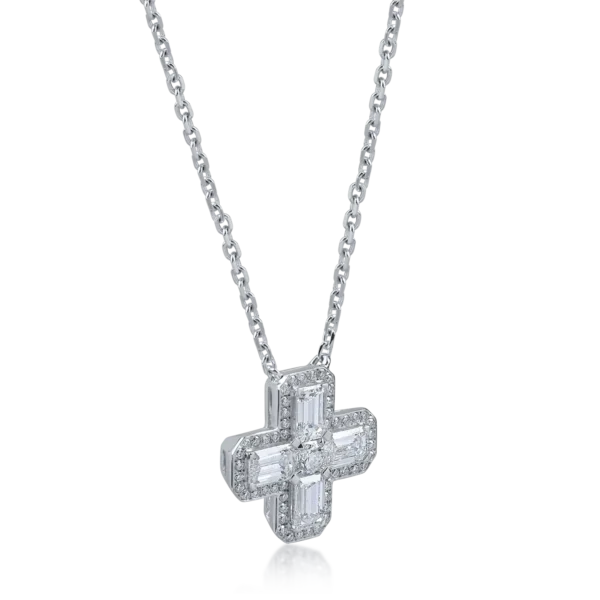 Lant cu pandantiv cruce din aur alb cu diamante baguette si rotunde de 1.4ct